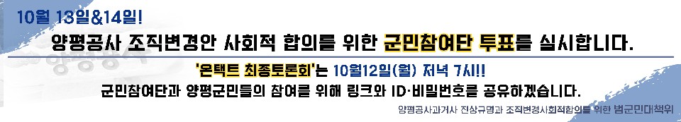 ¾çÆò°ø»ç °ú°Å»ç Áø»ó±Ô¸í°ú Á¶Á÷º¯°æ »çȸÀûÇÕÀǸ¦ À§ÇÑ ¹ü±º¹Î ´ëÃ¥À§¿øÈ¸(ÀÌÇÏ ¹ü´ëÀ§)°¡ ¿À´Â 12ÀÏ ¿Â¶óÀÎ Åä·Ðȸ¸¦ °³ÃÖÇϰí, À̾î 13~14ÀÏ ±º¹ÎÂü¿©´ÜÀÇ ÅõÇ¥¸¦ °ÅÃÄ ¾çÆò°ø»ç ģȯ°æ³ó»ê¹° À¯ÅëºÎ¹® Á¶Á÷º¯°æ »çȸÀû ÇÕÀǾÈÀ» ÃÖÁ¾ °áÁ¤ÇÑ´Ù.