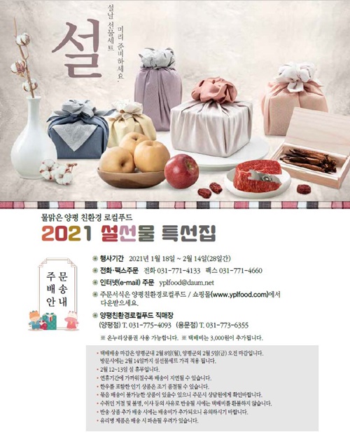 ¼³¸ÂÀÌ ³ó¡¤Æ¯»ê¹° ÆÇ¸Å Çà»ç´Â 2¿ù 14ÀϱîÁö ÁøÇàµÇ¸ç, Á¤À°¡¤°úÀÏ¡¤ÇѰú¡¤¾ç°î¡¤ÀüÅëÀå·ù µî ¼³ ¸íÀý °ü·Ã ¼±¹°¼¼Æ® ¿Ü¿¡µµ ³ó¹ÎµéÀÌ Á÷Á¢ »ý»êÇÑ ´Ù¾çÇÑ ³ó»ê¹°µéÀÌ ±âÁ¸ ÆÇ¸Å±Ý¾×º¸´Ù 10% Àú·ÅÇÑ °¡°ÝÀ¸·Î ÆÇ¸ÅµÇ¸ç 100¸¸¿ø ÀÌ»ó ±¸ÀÔ ½Ã 5%ÀÇ Ãß°¡ ÇÒÀÎ ÇýÅõµ ÁÖ¾îÁø´Ù.